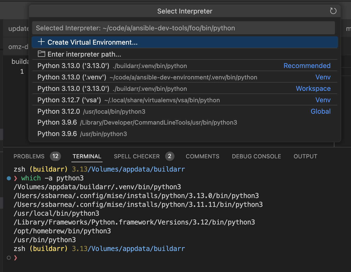 Please remark that while the .venv is detected, the two mise installed pythons are not suggested by vscode when it comes to selecting a python interpreter, even if they are in PATH. This is an issue especially for projects that do not use a .venv, and most python ones that use tox, do not have one as they rely on tox to manage these.