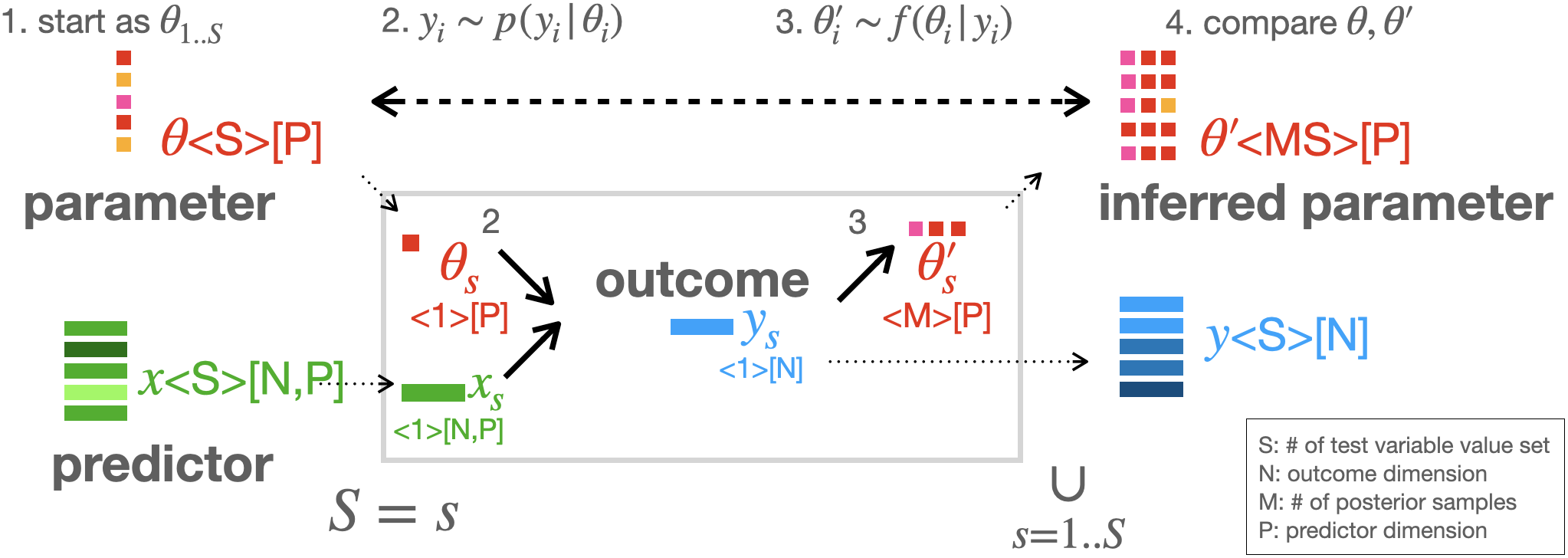 In SBC, parameter, predictor, hyperparameter are three input variables that verify the performance of your proposed generator and inference engine via simulation [1]. Specific values are assumed for each variable based on which outcome variable and posterior sample values are simulated. With this assumed input and retrieved output values, SBC quantifies how much your generator+inference engine is self-consistent based on the fact that ranks are uniform if the distribution of input and output random variable are equal (proof from Talts et al., 2018). In this sense, rvar<ndraws>[dim] datatype whose definition is multidimensional, sample-based random variable representation, fits this simulation-based test goal. Different input variable values are tested but they are different faces of the same variable. In the SBC workflow figure below, S is the number of initial parameter values, N is the outcome variable dimension, and M is the number of final posterior samples.