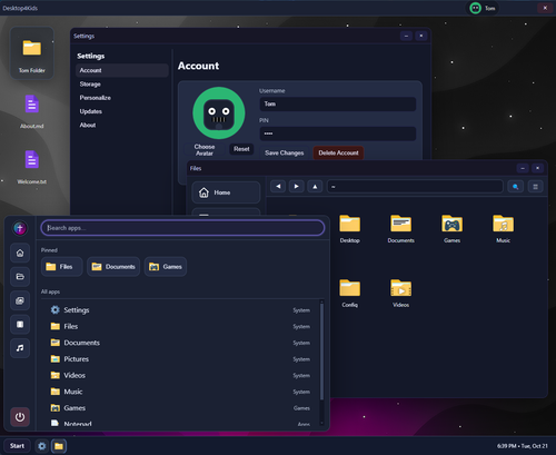 Desktop4Kids OS is a browser-based desktop simulation built with Electron that runs entirely offline.