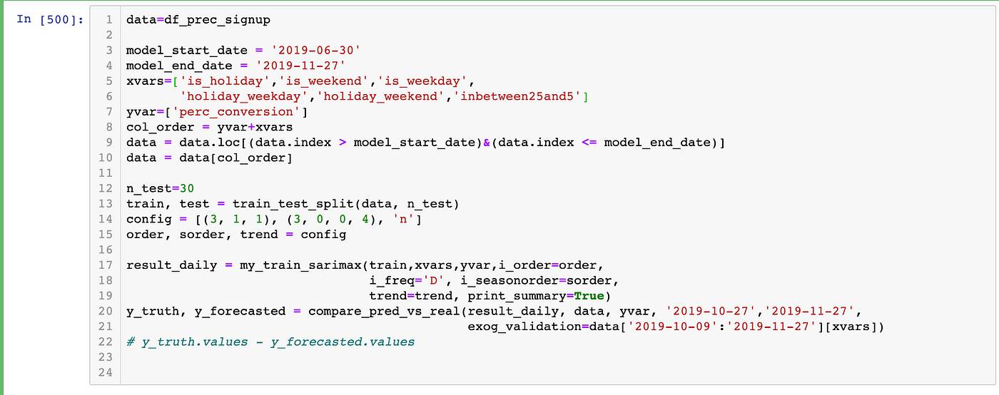 We worked on creating a ‘self-learning time series forecasting model’ to predict enrollments in the future. The entire model is a pipeline of two separate models — a seasonal ARIMA model and a dynamic regression model that works on top of the seasonal ARIMA model to predict future enrollments. For web traffic data, there are high chances of observing seasonality (weekly, monthly, yearly, etc) in user flow and hence we decided to use the seasonal ARIMA model as the first step to forecasting. We built a ‘self-learning’ SARIMA model by auto-tuning the hyperparameters for a seasonal ARIMA model. The following piece of the code shows how a grid of hyperparameter can be defined using our code to configure the seasonal ARIMA model.