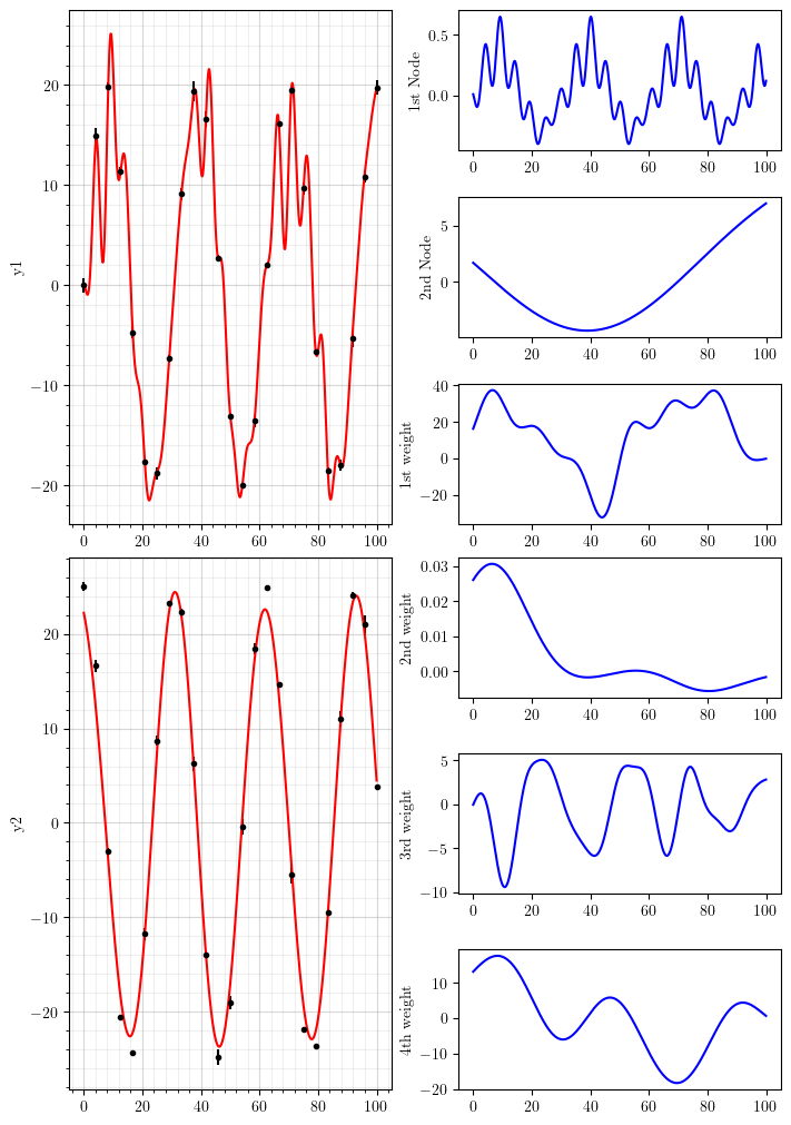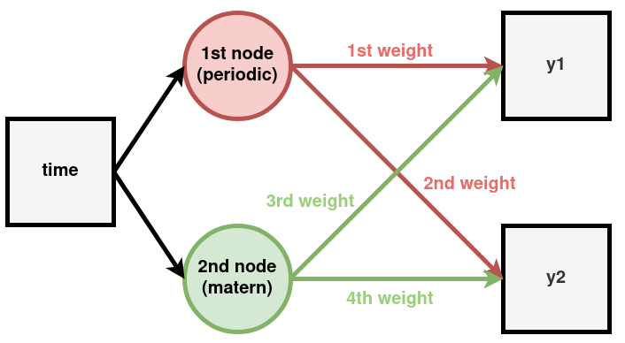 What do I mean by that? On the list weight, the first one (covfunc.SquaredExponential(20, 5)) connects the first node to the first dataset. The second weight (covfunc.SquaredExponential(0.1, 10)) connects the first node to the second dataset. The third weight (covfunc.SquaredExponential(10, 5)) connects the second node to the first dataset. The fourth and last weight (covfunc.SquaredExponential(1, 10)) connects the second node to the second dataset. Think on it like you first connect a node to all the datasets, then you connect the following node to all datasets, etc...