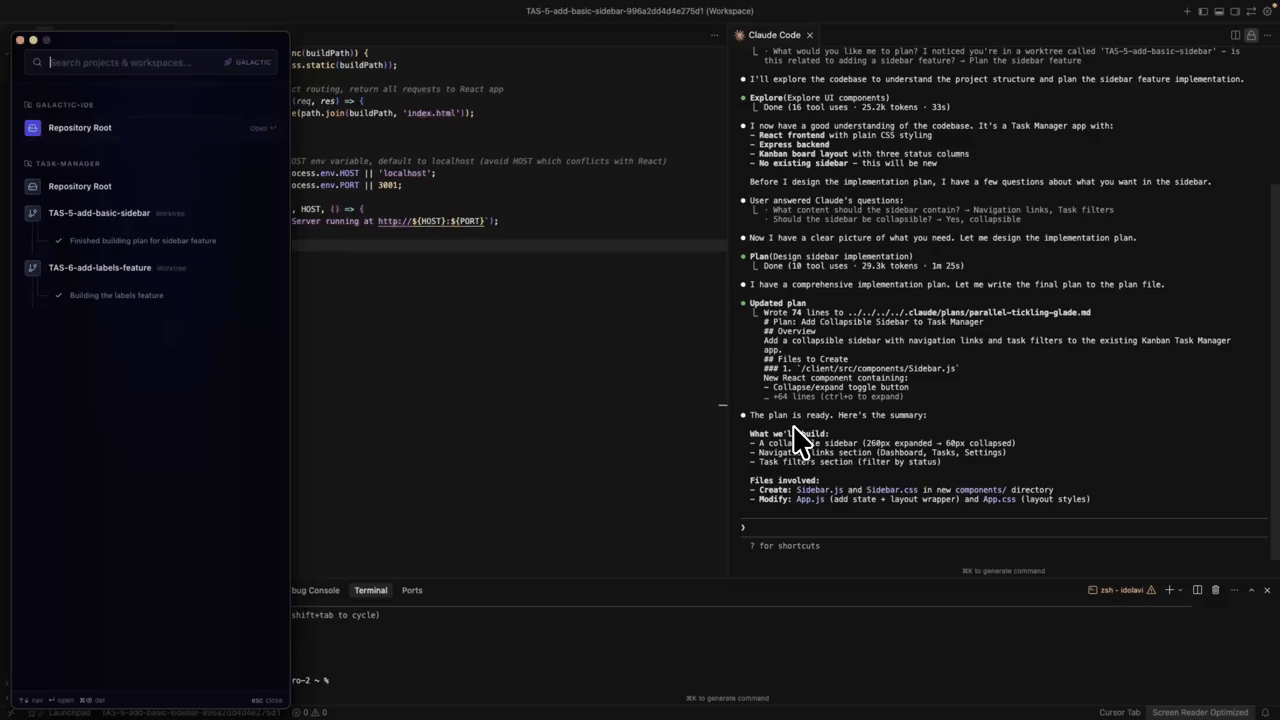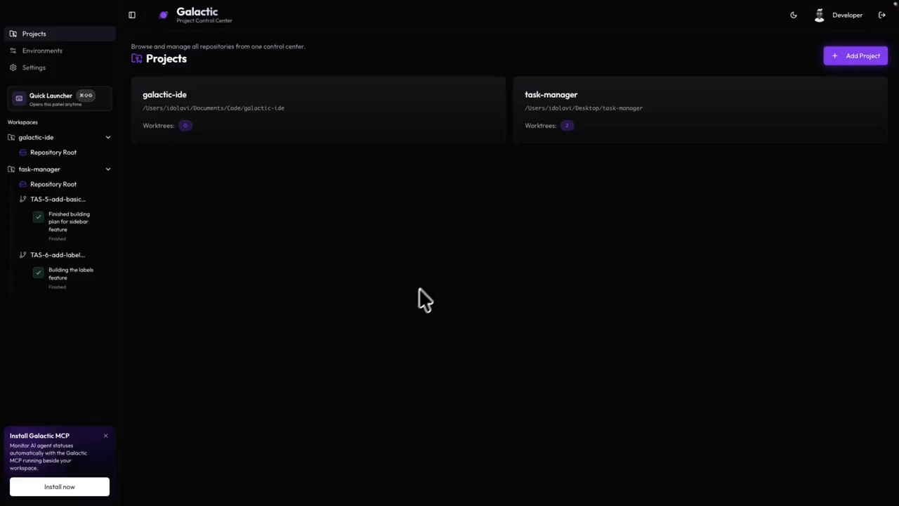 Press Cmd+Shift+G anywhere on your Mac to summon a floating sidebar with all your projects, workspaces, and active agent sessions. Jump into any workspace instantly without switching to Galactic first.