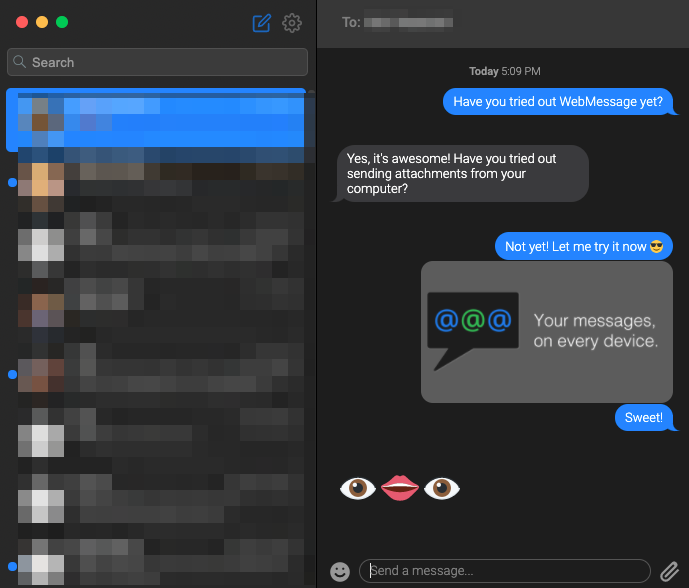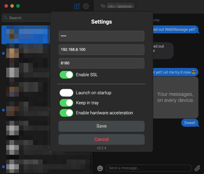 WebMessage A messaging client, meant to work with the WebMessage tweak for jailbroken iOS devices. Donating If you would like to support my work, you can donate using this link. Screenshots Development Installs required dependencies yarn install Compiles and hot-reloads for development yarn serve Compiles and bundles for production yarn build