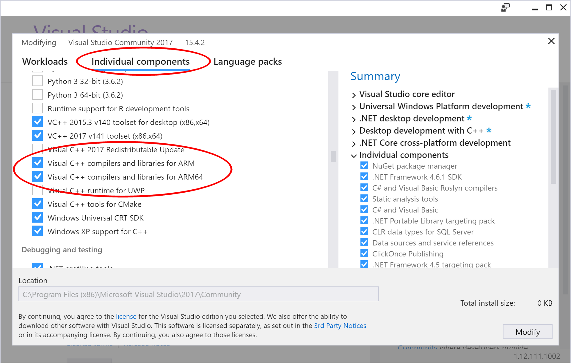 Please be mindful that, to enable ARM compilation support in Visual Studio 2017, you MUST go to the Individual components screen in the setup application and select the ARM compilers and libraries there, as they do NOT appear in the default Workloads screen: