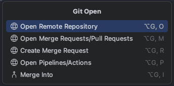 Git Open menu: If you have the Git Open plugin installed, Merge Into will automatically appear in the Git Open action group.