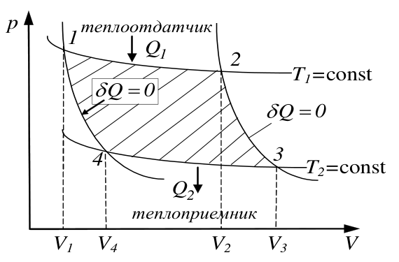 Цикл Карно — обратимый термодинамический цикл, состоящий из 2 адиабатных и 2 изотермических процессов