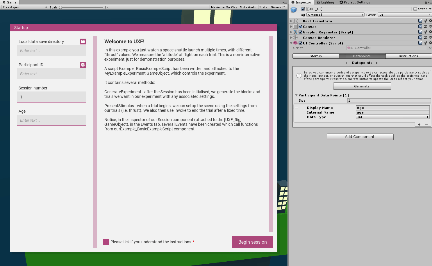 The UI consists of several features, including a series of inputs allowing collection of demographic data, as well as space for presenting instructions. The UXF UI can be configured, including disabling it completely.