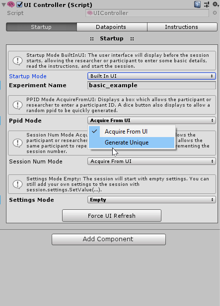 The data points that the UI collects can be customised. For example, you can collect age, gender, or any other value such as the assigned group in your experiment. This is done via the ExperimentStartupController component inspector. The participant ID is always collected as it is used in the file output.