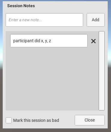 Allows researchers to add notes to a session, which will be stored in a notes.json file in the Session folder. It also features a checkbox to conveniently mark a session as "bad" such that it can be excluded from later analysis. It can be accessed by clicking the button on the Info bar or (by default) the F1 key.