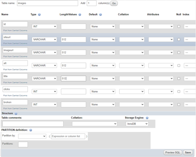 Now, for the table(images): id, siteurl, imageurl, alt, title, clicks, broken.