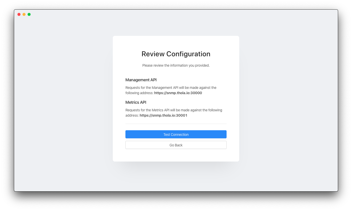 In the last step of the initial setup process, you can review your configuration and then start a validation reqeust against the Management and Metrics Endpoints. Once successful, you will be redirected to the welcome page of the SNMP Sim UI.