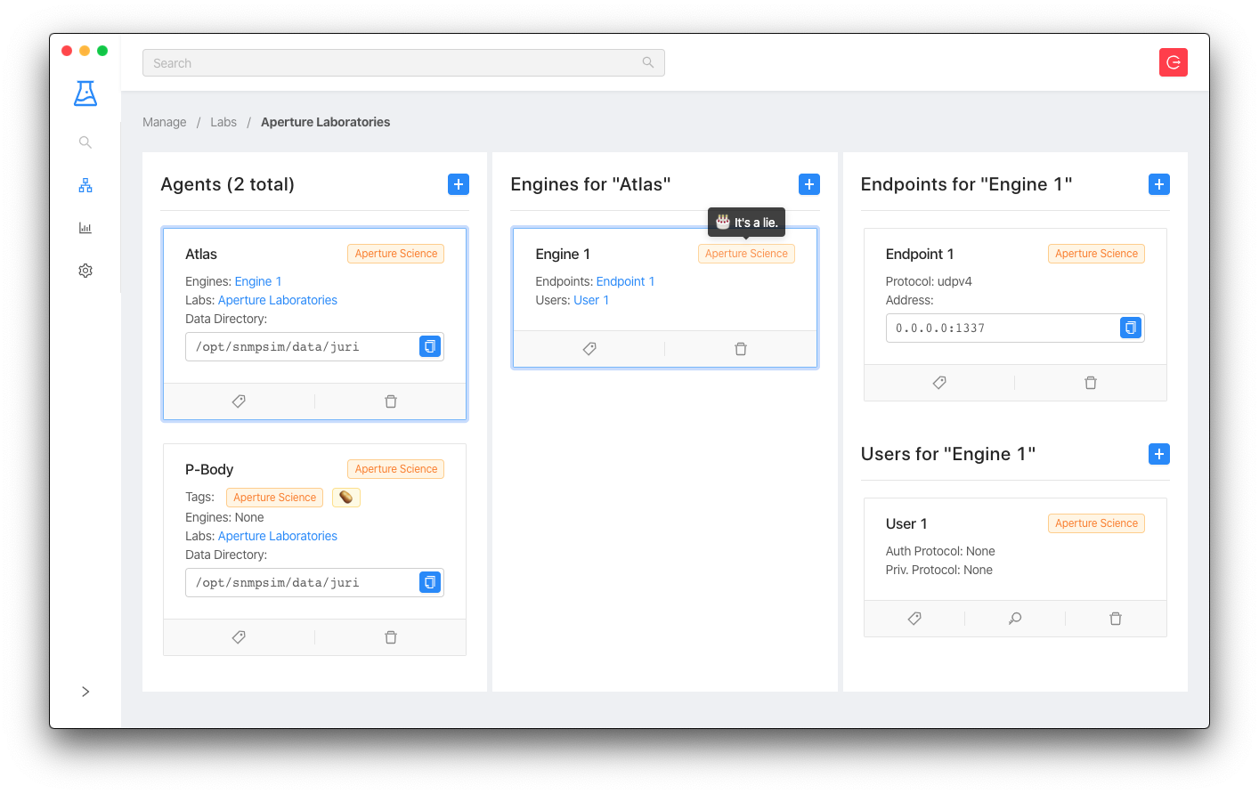 The SNMP Sim UI (short for SNMP Simulator User Interface) is both a Web and Desktop Application used to manage multiple simulated SNMP objects such as Agents, Engines, Endpoints, and Users which are grouped into Labs.