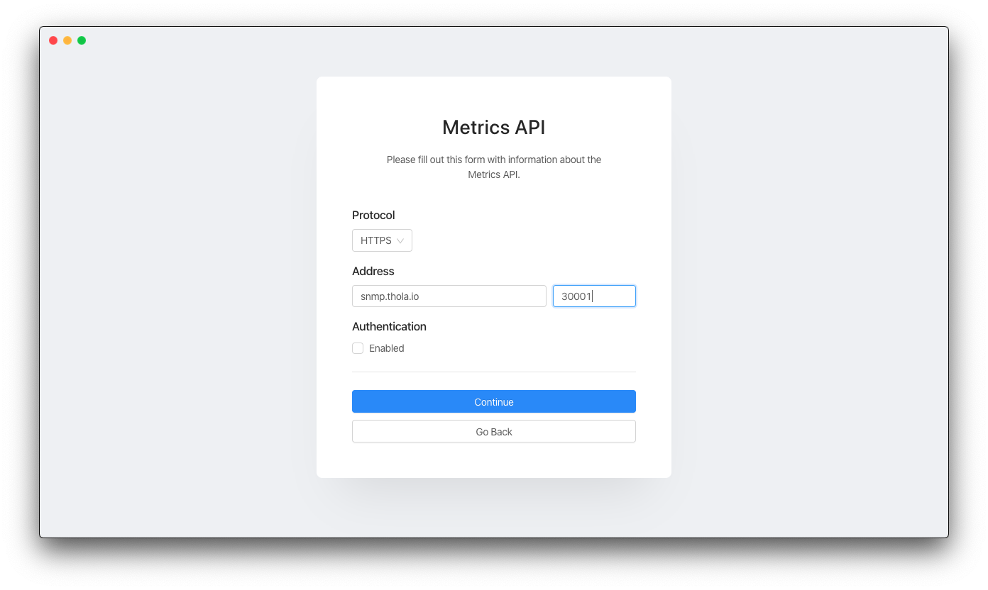 The next step is the same for the Metrics API. You again have to specify the Address and the Port on which the Metrics API is listening. Most of the information will be prefilled from the previous step.