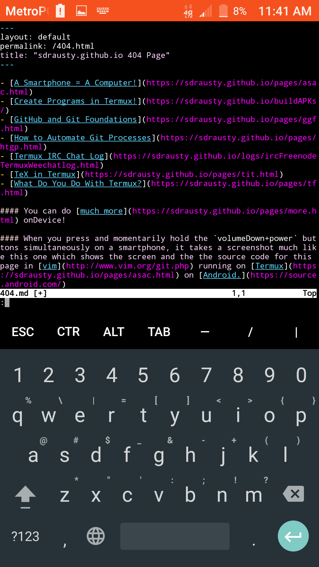 When you press and momentarily hold the volumeDown+power buttons simultaneously on a smartphone, it takes a screenshot much like this one which shows the screen and the the source code for this page in vim running on Termux on Android.