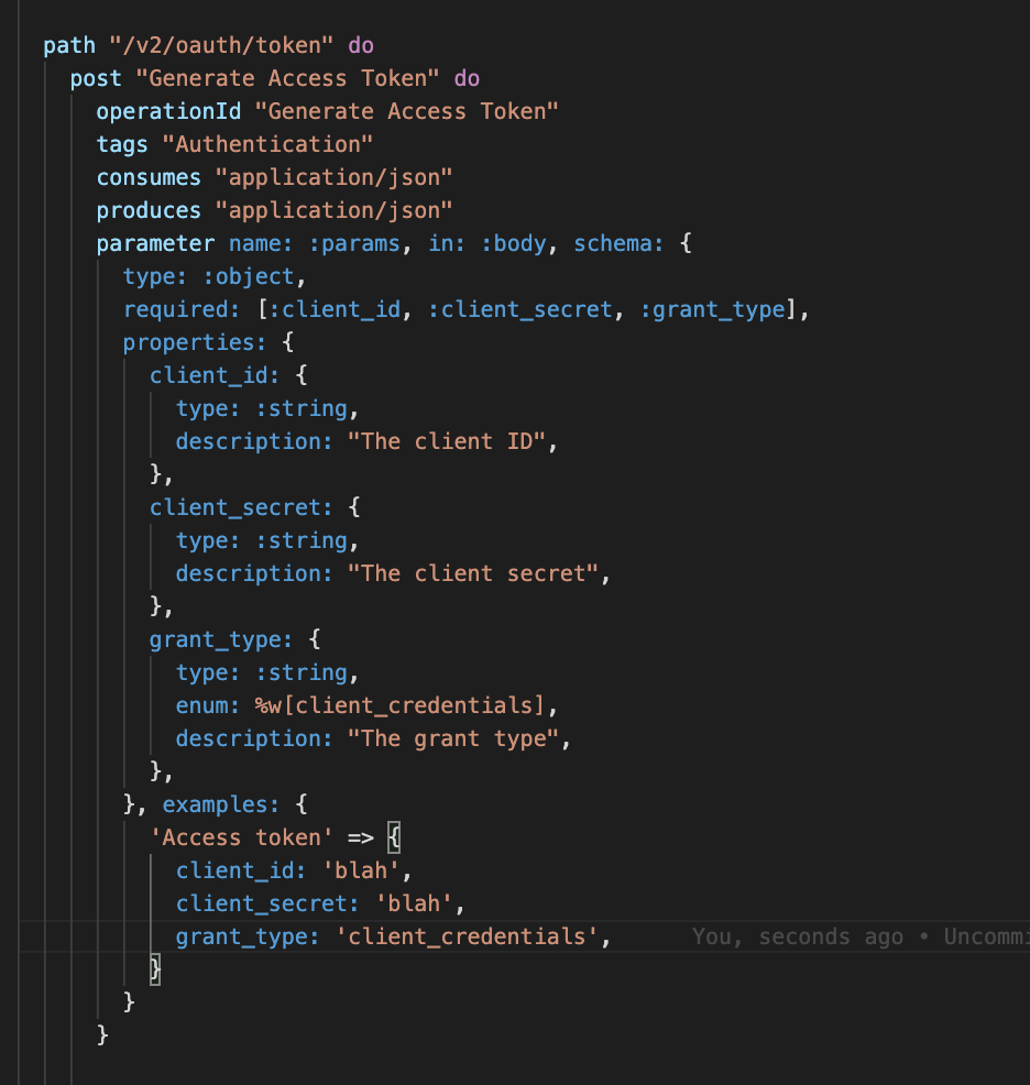 client_id: 'blah etc'where See chapter Request Body Examples here: https://swagger.io/docs/specification/describing-request-body/ In other words, this is what you want requestBody: