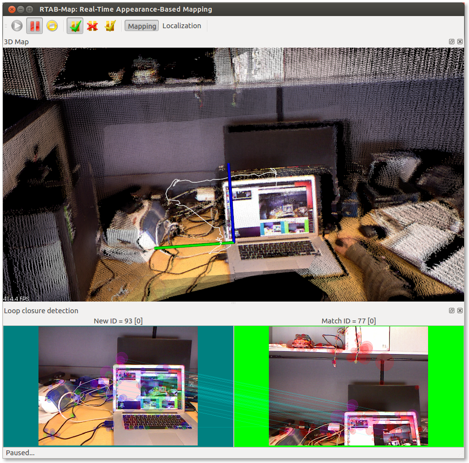 $rosservice call /reset_odom). Don't forget to replace the camera to a scene with a lot of texture before resetting, otherwise the odometry won't still be able to start at all (RED background will stay here). Resetting the odometry will make RTAB-Map to create a new map, so the map should disappear and a new one is shown:
