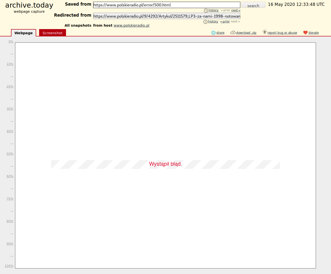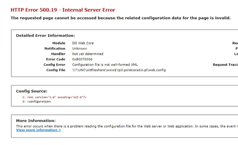 Uszkodzona została również podstrona Polskiego Radia (lp3.polskieradio.pl). W tym przypadku z pliku konfiguracyjnego usunięty został znak <, przez co strona nie wczytuje się poprawnie [backup].