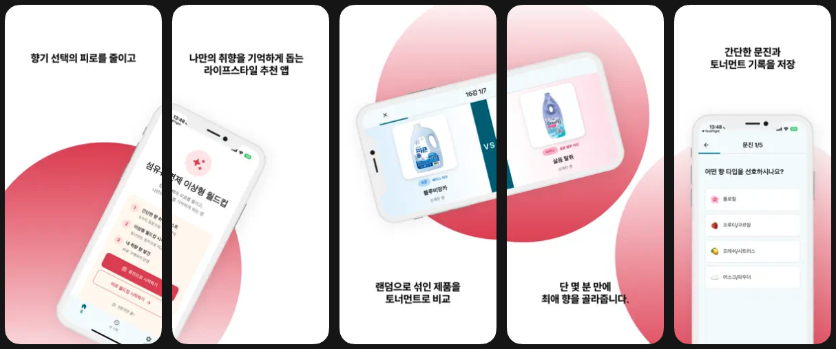 반복을 깨고, 이상형 월드컵 방식으로 자신의 향 취향을 재미있게 찾을 수 있도록 기획했습니다.