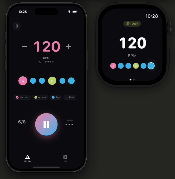 Apple Watch 햅틱 피드백으로 박자를 체감할 수 있는 연습 도구를 만들었습니다.