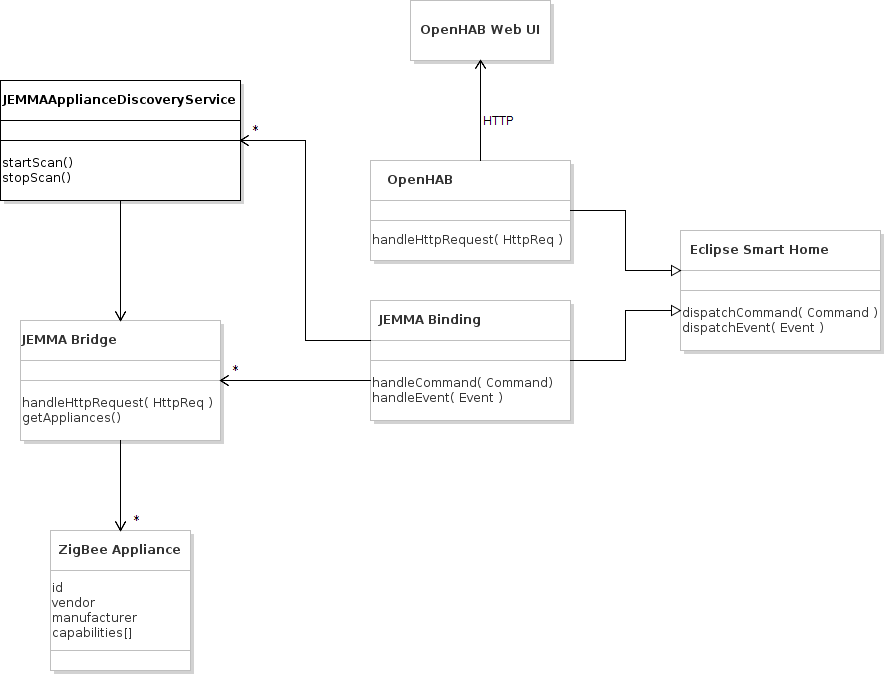 The JEMMA remote binding provides a preliminary approach toward its complete integration inside OpenHAB and the eclipse smarthome ecosystem. In order to fit into the eclipse smarthome architecture each JEMMA gateway has been molded as a Bridge entity that offers a way to access every appliance it manages. Each type of appliance has its own ThingHandler