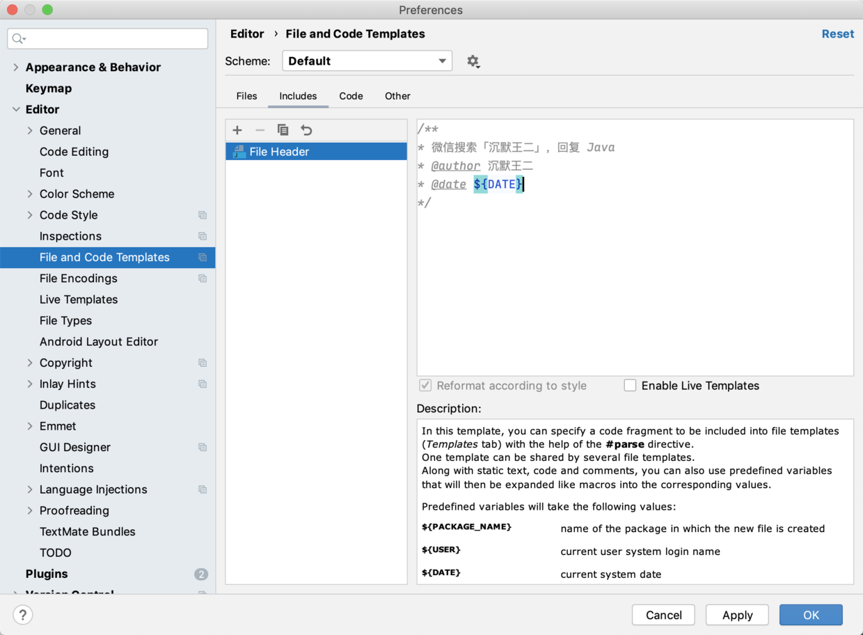 Intellij IDEA 中可以在「File and Code Templates」中设置。