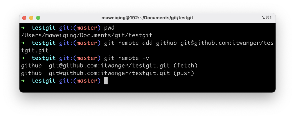 在本地仓库中执行 git remote add 命令将 GitHub 仓库添加到本地: