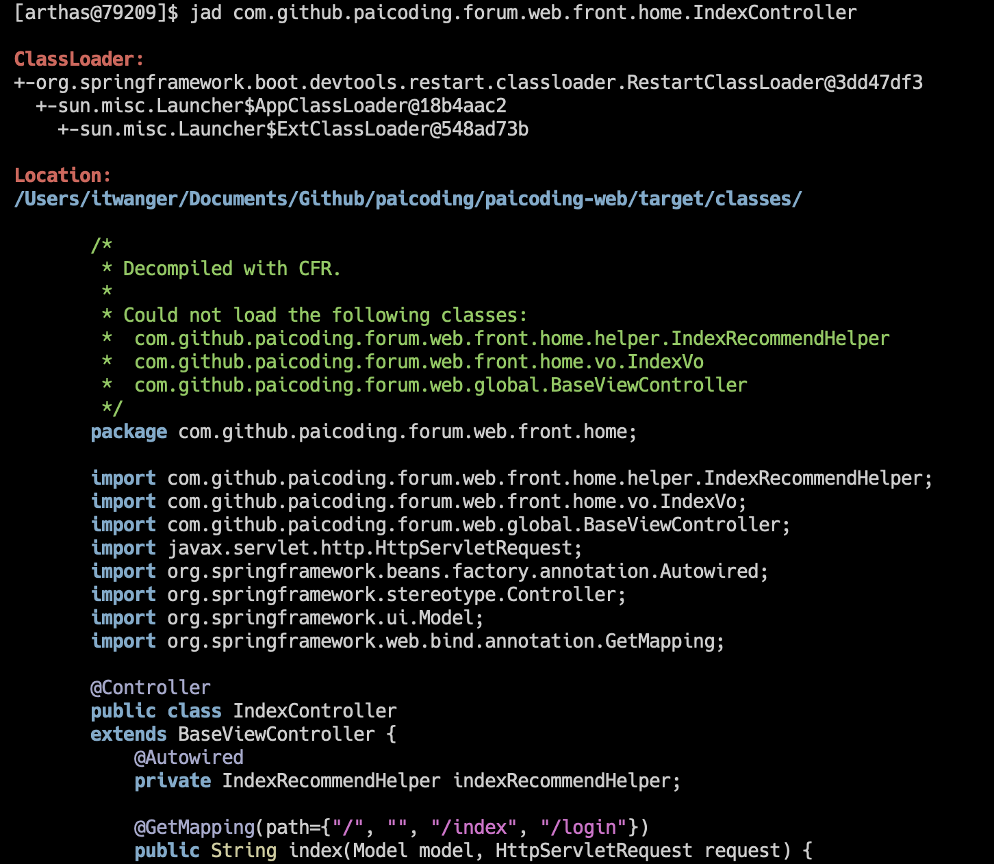 示例 1:通过 jad com.github.paicoding.forum.web.front.home.IndexController 反编译类的字节码: