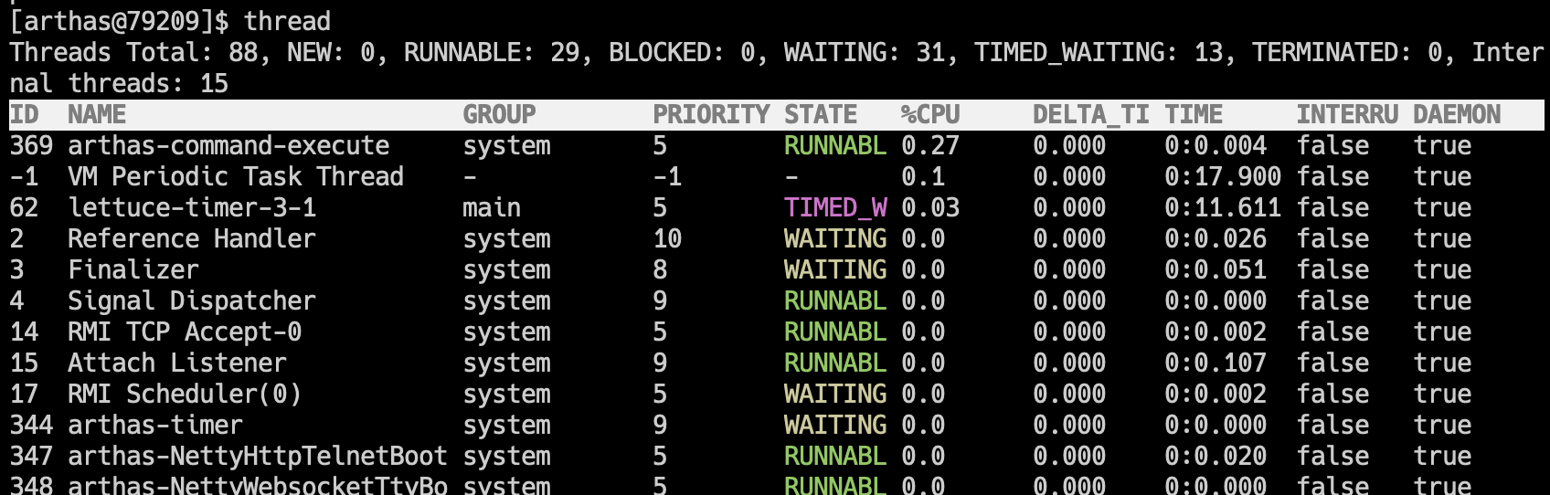 thread 命令可以查看线程的信息,包括线程的状态、线程的堆栈等。