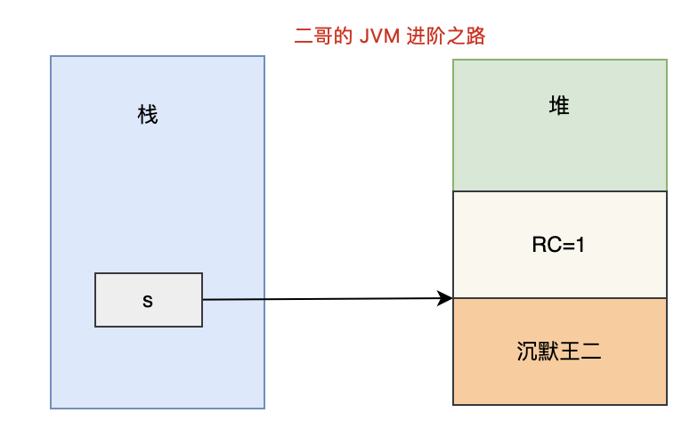 String s = new String("沉默王二");我们来创建一个字符串,这时候"沉默王二"有一个引用,就是 s。此时 Reference Count 为 1。