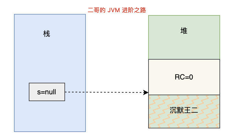 s = null;这时候"沉默王二"的引用次数就等于 0 了,在引用计数算法中,意味着这块内容就需要被回收了。