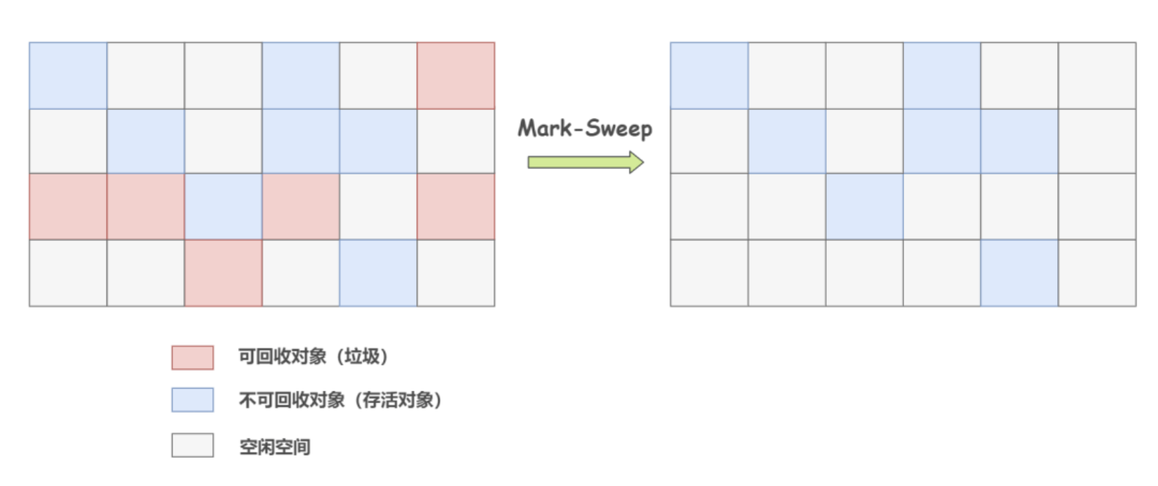 标记清除算法(Mark-Sweep)是最基础的一种垃圾回收算法,它分为 2 部分,先把内存区域中的这些对象进行标记,哪些属于可回收的标记出来(用前面提到的可达性分析法),然后把这些垃圾拎出来清理掉。