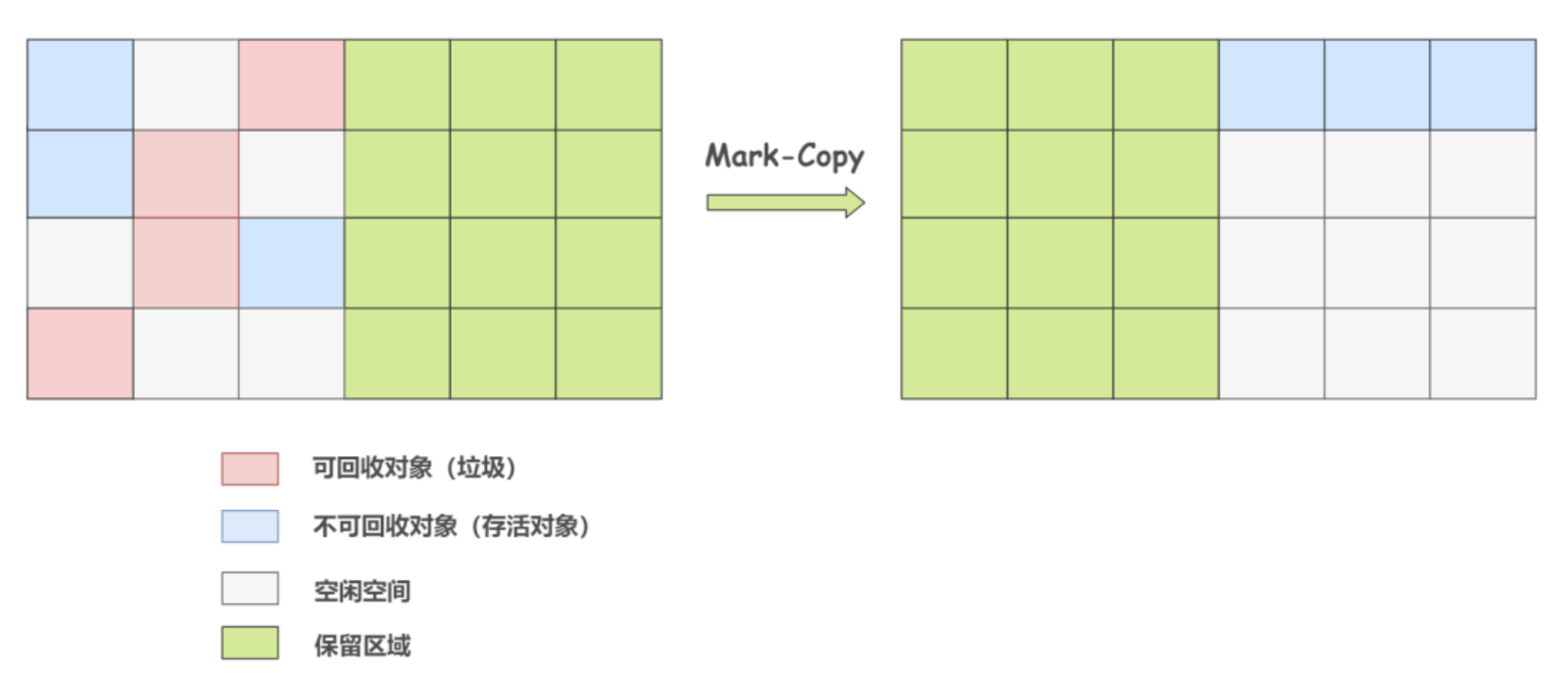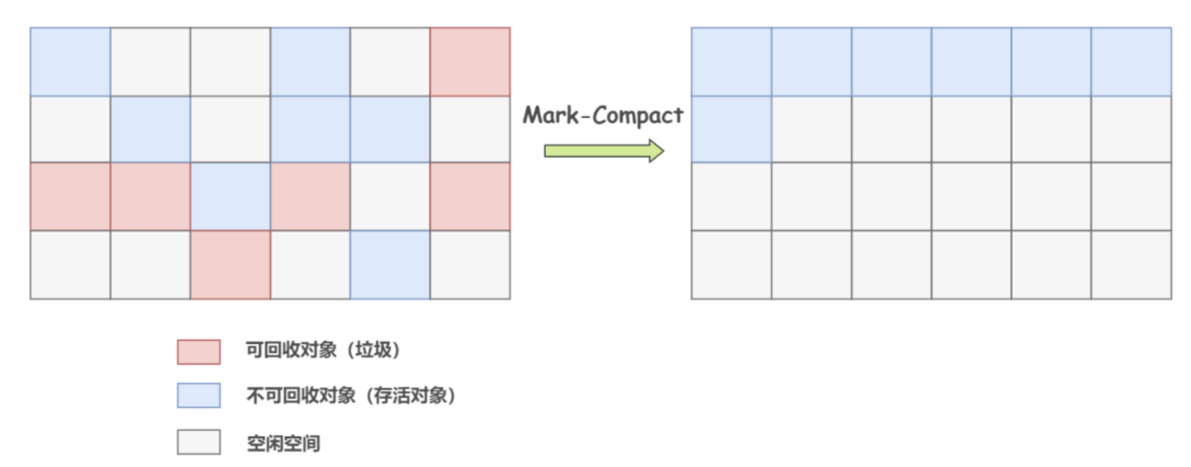 就像上图一样,清理掉的垃圾就变成可使用的空闲空间,等待被再次使用。逻辑清晰,并且也很好操作,但它存在一个很大的问题,那就是内存碎片。碎片太多可能会导致当程序运行过程中需要分配较大对象时,因无法找到足够的连续内存而不得不提前触发新一轮的垃圾收集。