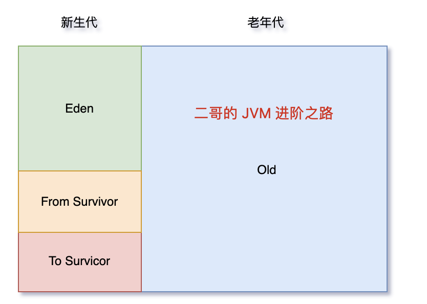 堆主要分为 2 个区域,年轻代与老年代,其中年轻代又分 Eden 区和 Survivor 区,其中 Survivor 区又分 From 和 To 两个区。