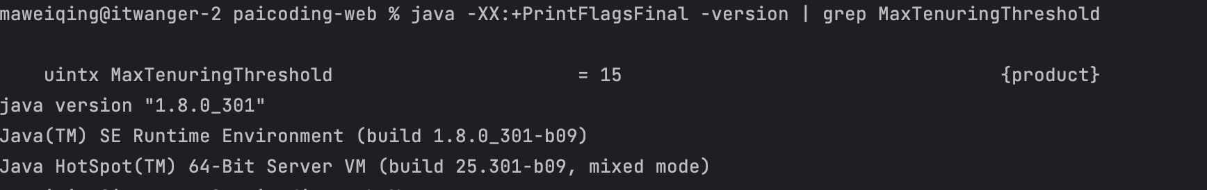 可通过 java -XX:+PrintFlagsFinal -version | grep MaxTenuringThreshold 查看默认的阈值。