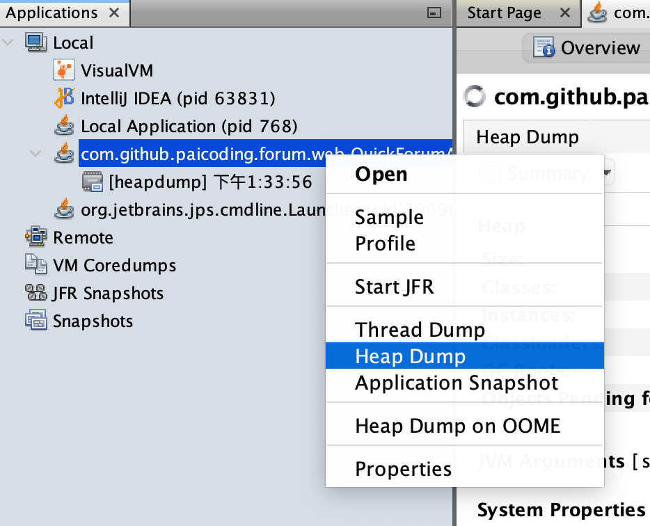 ①、在应用程序面板中右键选择堆Dump(也就是 Heap Dump)。