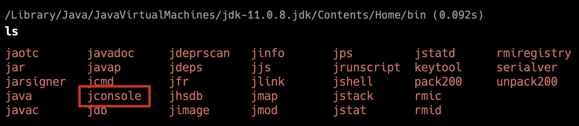 JConsole 程序位于%JAVA_HOME%bin 目录下,不过我当前的操作系统是 macOS,和 Windows 有一些不一样,我就不再刻意截 Windows 的图了,希望大家可以理解。