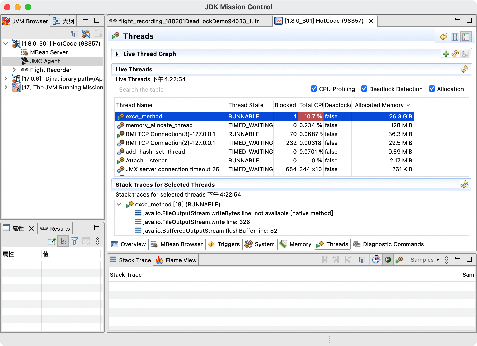 如下图,JConcole 显示了应用系统内的线程数量,左下方显示了程序中所有的线程。点击线程名称,就可以查看线程的栈信息。
