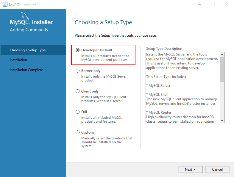 当出现下面这一步时,选择默认的开发者模式就好(会安装 MySQL 服务器「必须」、MySQL Shell「命令行操作」、MySQL 连接器「支持编程语言和 MySQL 之间的通信」等)。