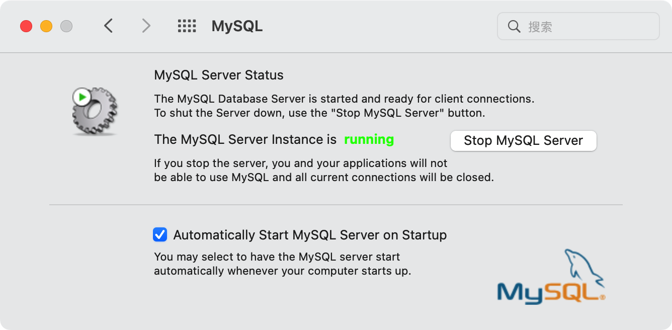 安装完成后,会在系统偏好设置里出现一个 MySQL 的服务图标,如下图所示。