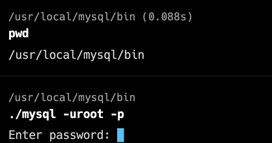 在默认情况下,终端会在系统的 PATH 环境变量中查找可执行文件。然而,由于我使用的是 MySQL 安装包而不是 homebrew,当前目录(.)不包含在 PATH 环境变量中。这意味着如果直接输入 mysql -uroot -p,终端将无法找到 mysql 命令。