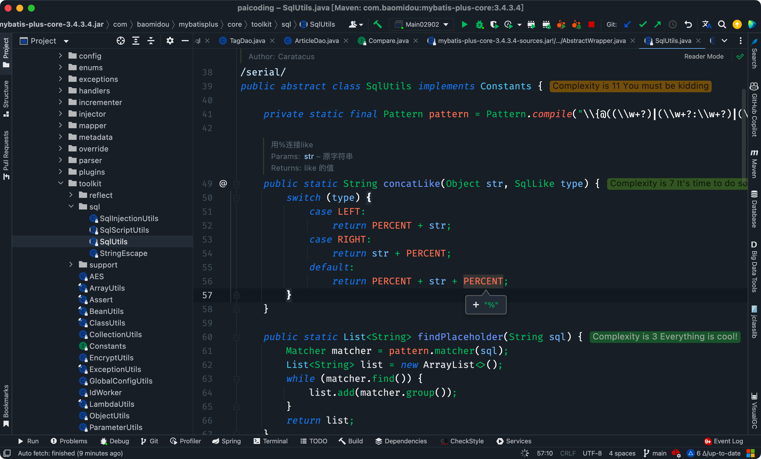 源码在 SqlUtils 类的 concatLike 方法中,通过判断通配符的位置来拼接通配符 %。
