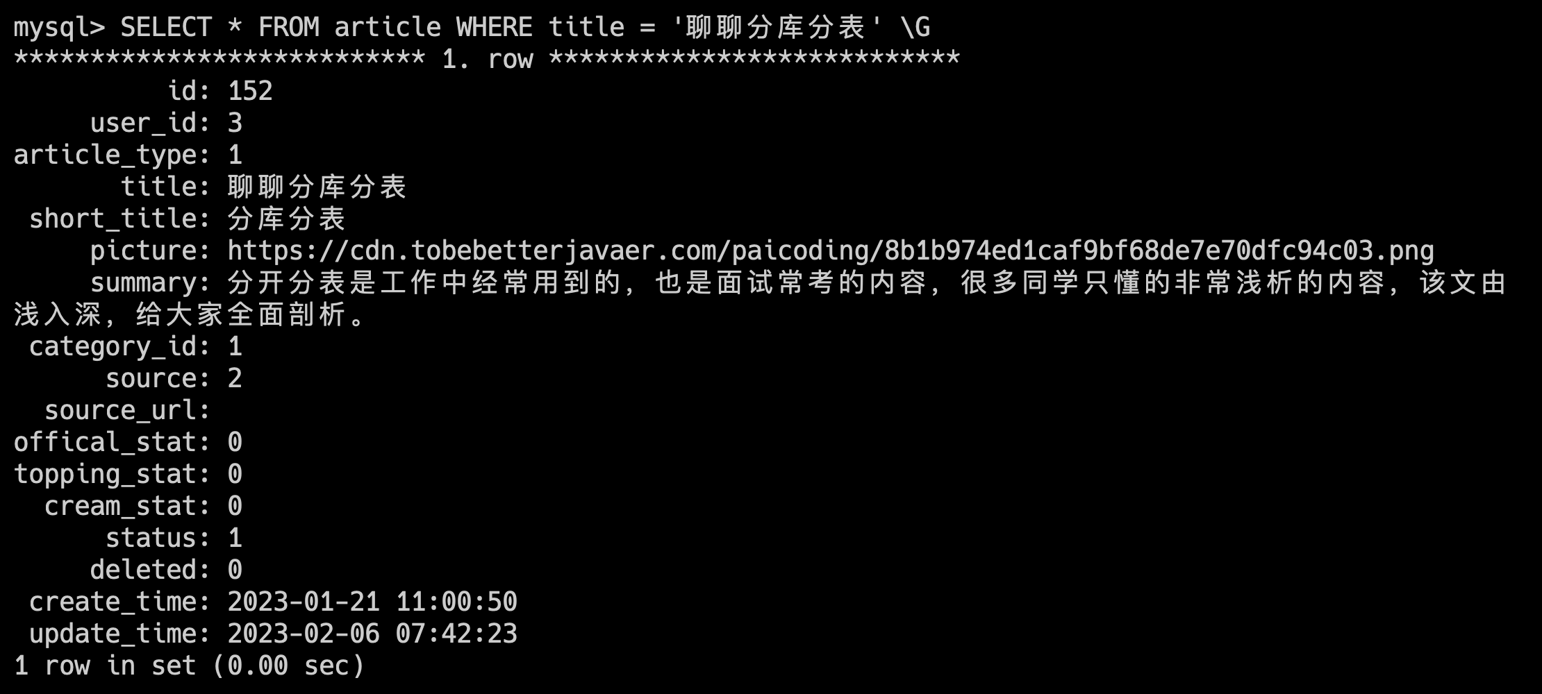 我们仍然以技术派的文章表 article 为例,比如说我们要查找标题为“聊聊分库分表”的文章,可以这么写: