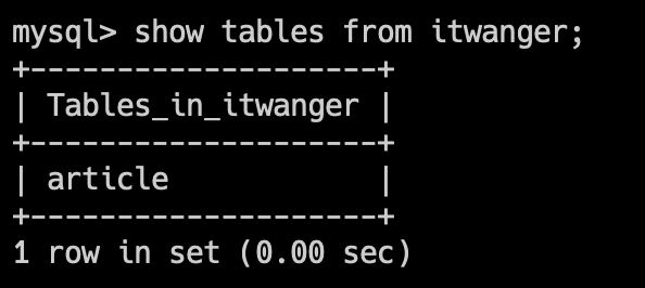 执行上述语句后,可以使用 show tables; 命令查看当前数据库中的所有表,可以看到,已经创建了一张 article 表。