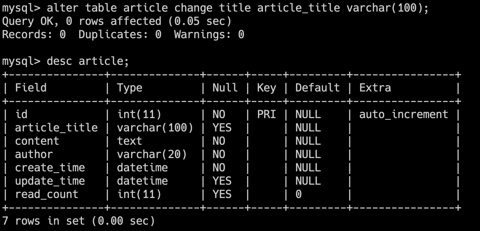 alter table 表名 change 原列名 新列名 数据类型;例如,我们要修改 article 表中的 title 字段名为 article_title,那么可以这样写: