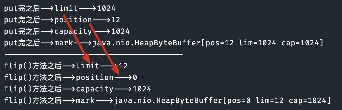 System.out.println("flip()方法之后-->mark--->" + byteBuffer.mark());再看看 4 个核心属性的值会发生什么变化: