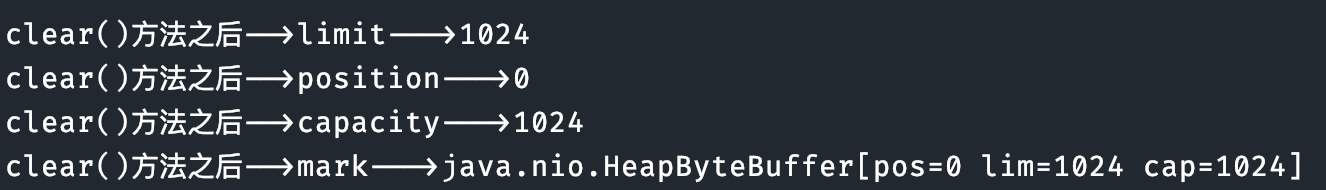 初始时-->mark--->java.nio.HeapByteBuffer[pos=0 lim=1024 cap=1024]