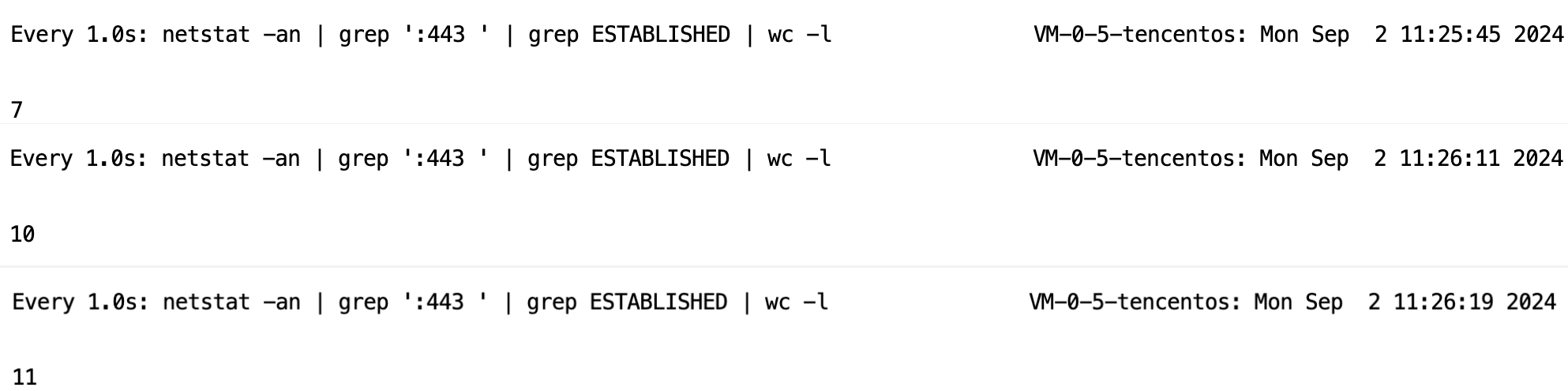 watch -n 1 "netstat -an | grep ':443 ' | grep ESTABLISHED | wc -l"解释一下: