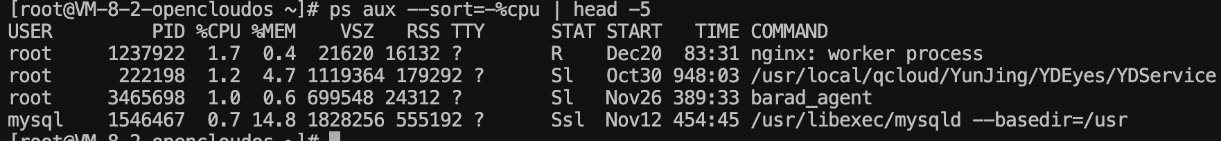 ps aux --sort=-%cpu | head -5可以查看 CPU 使用率最高的 5 个进程。
