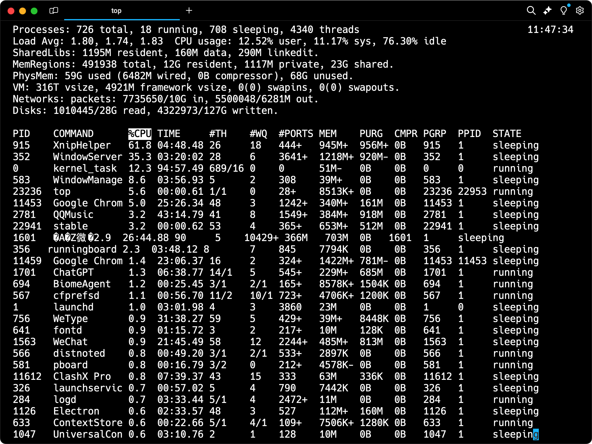 top 命令是实时查看系统性能的常用工具,系统负载信息通常显示在 top 命令输出的顶部。它还显示了系统运行的进程、内存使用情况等。