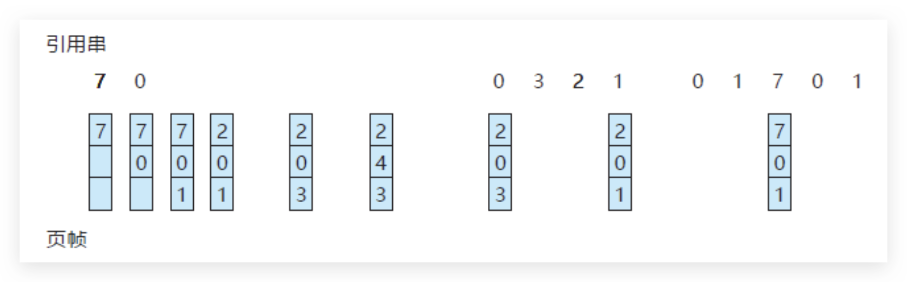 基本思路是,优先淘汰最早进入内存的页面。FIFO 算法维护一个队列,新来的页面加入队尾,当发生页面置换时,队头的页面(即最早进入内存的页面)被移出。